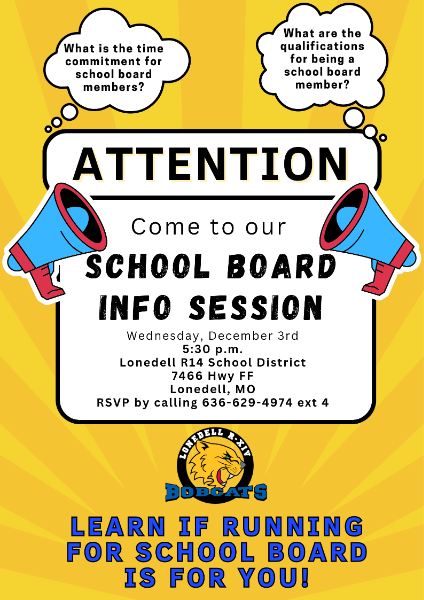 Lonedell R-14 will be holding a school board member information session for those that may be interested in running for school board.  Candidates must file by December 30, 2025 to be on the April 2026 ballot.